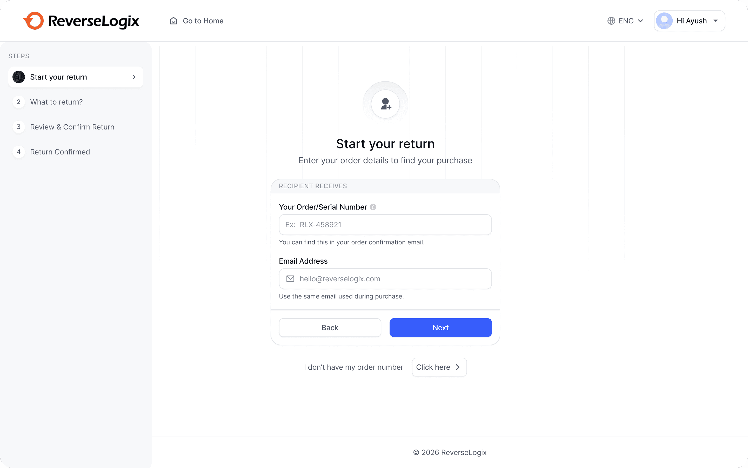After selecting Start a Return, users must identify their purchase by entering order details.