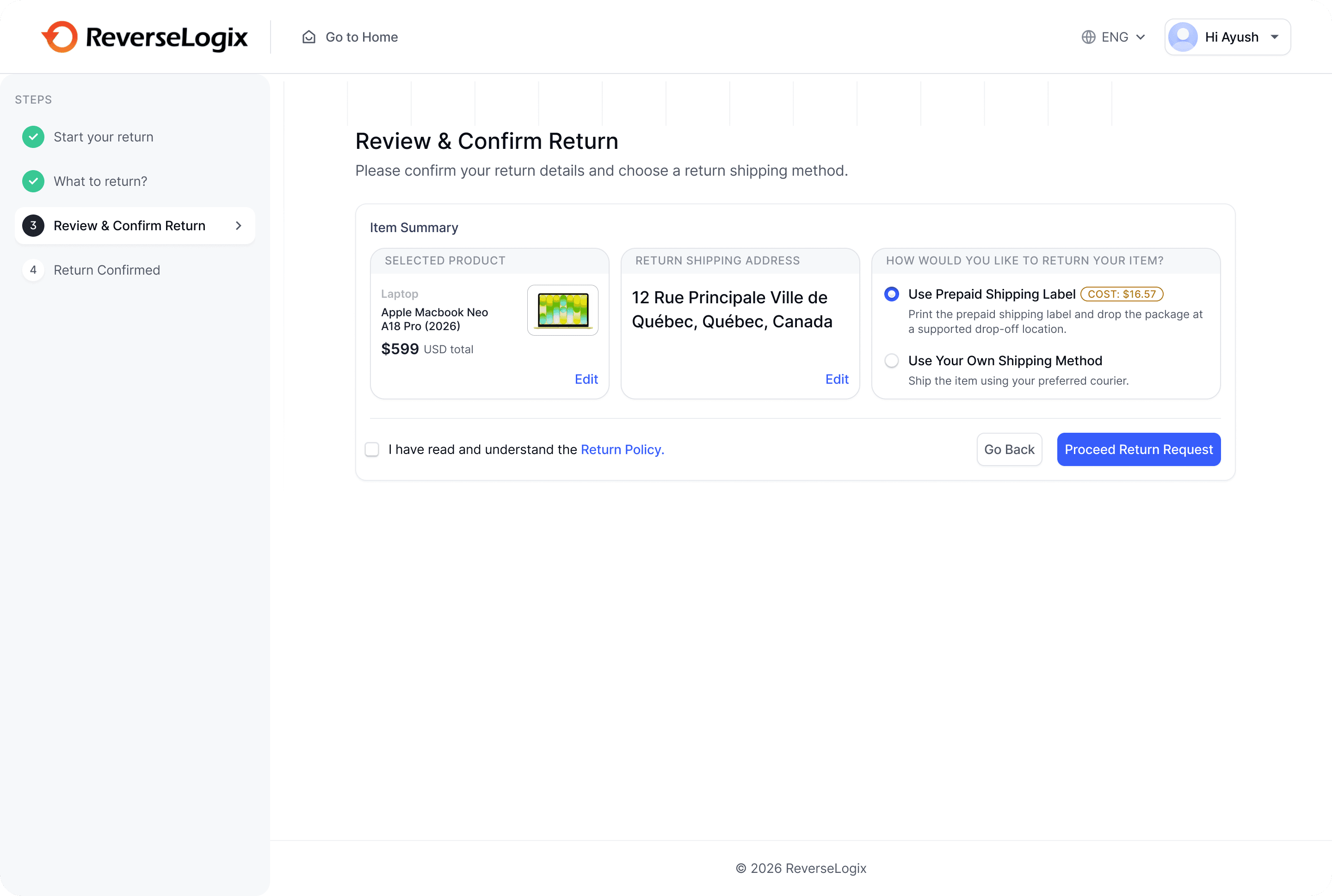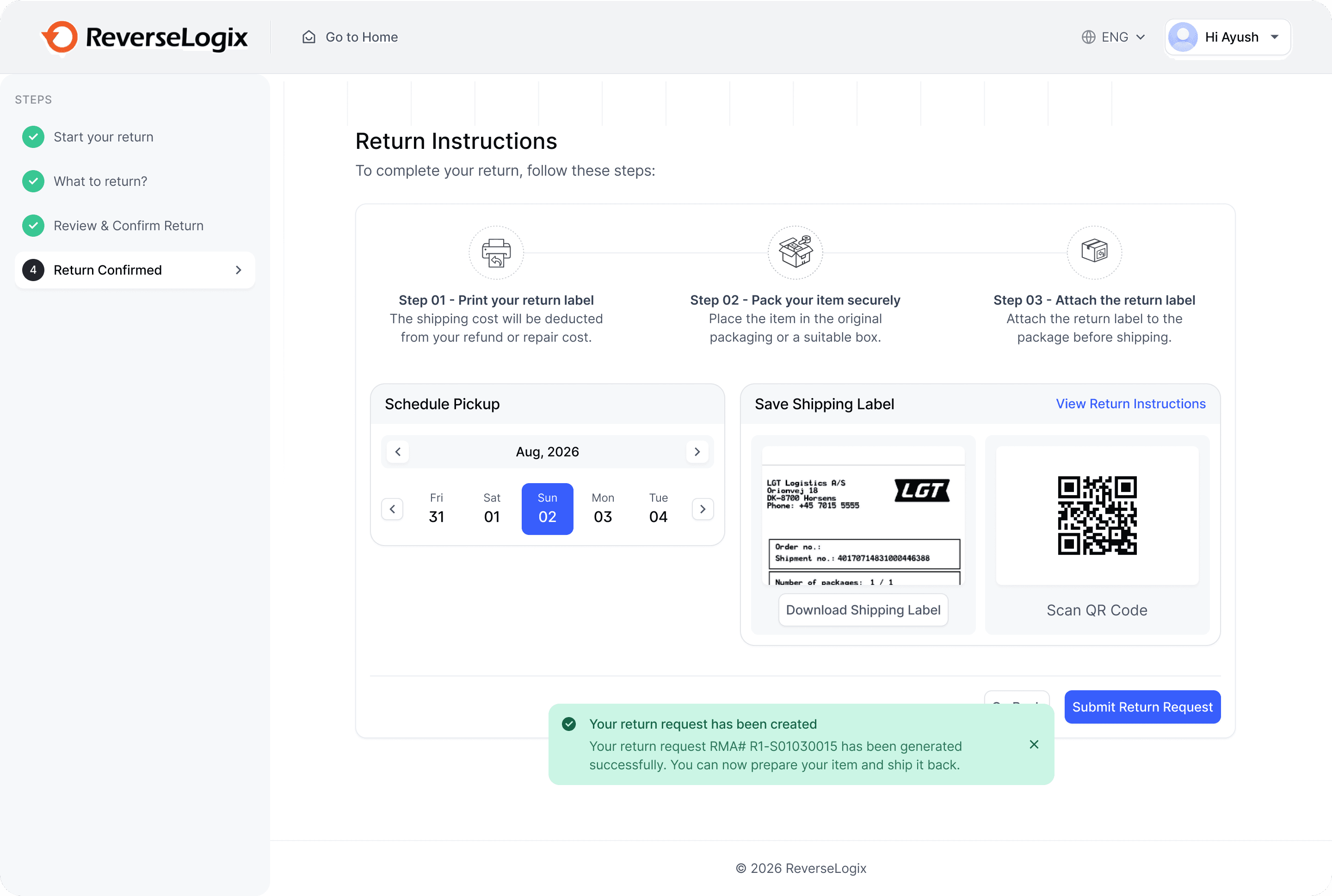 After reviewing the return request, users must confirm their return details and choose a shipping method before submitting the return.