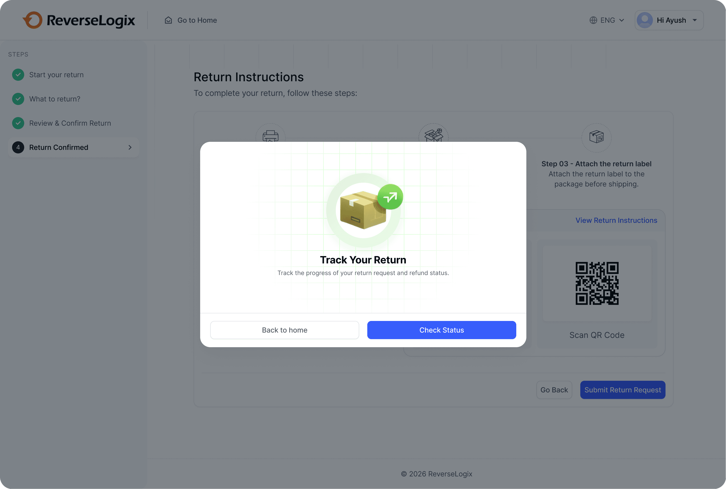 I introduced a post-submission modal that guides users toward tracking their return status. The modal appears immediately after the return request is successfully created.