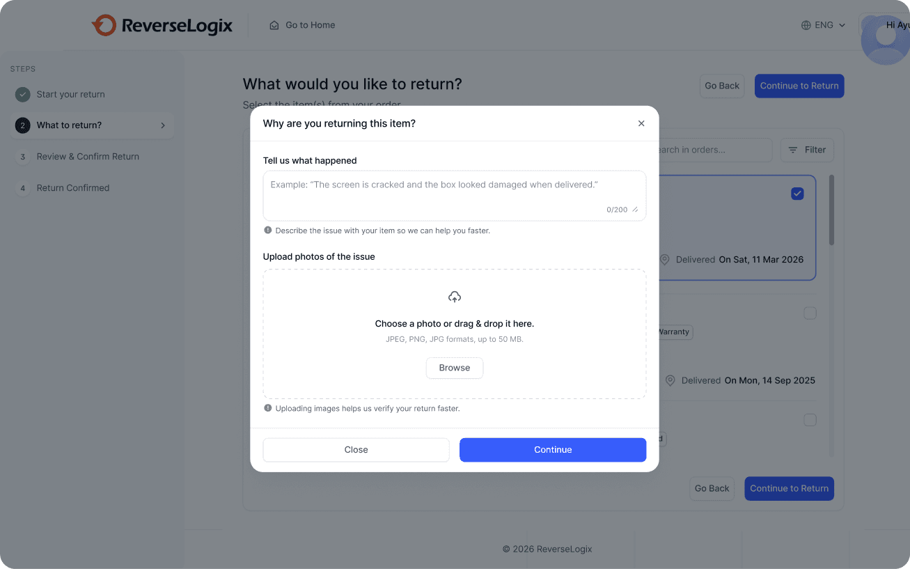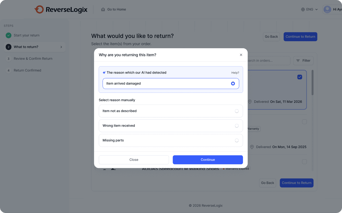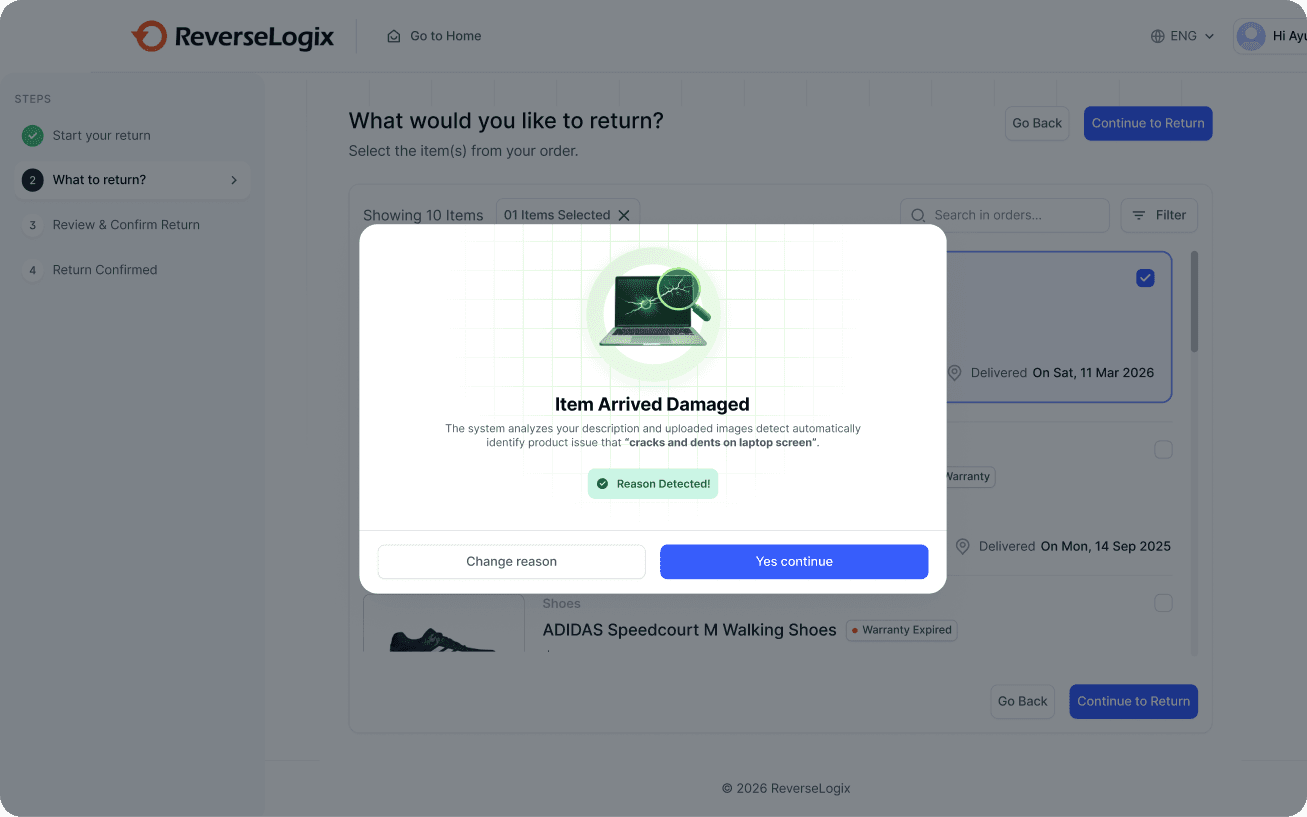 This step is operationally critical because the selected return reason drives downstream logistics decisions. I introduced AI-assisted reason detection so users can describe issues naturally while the system categorizes them accurately. This improves data quality and enables automated approval workflows.